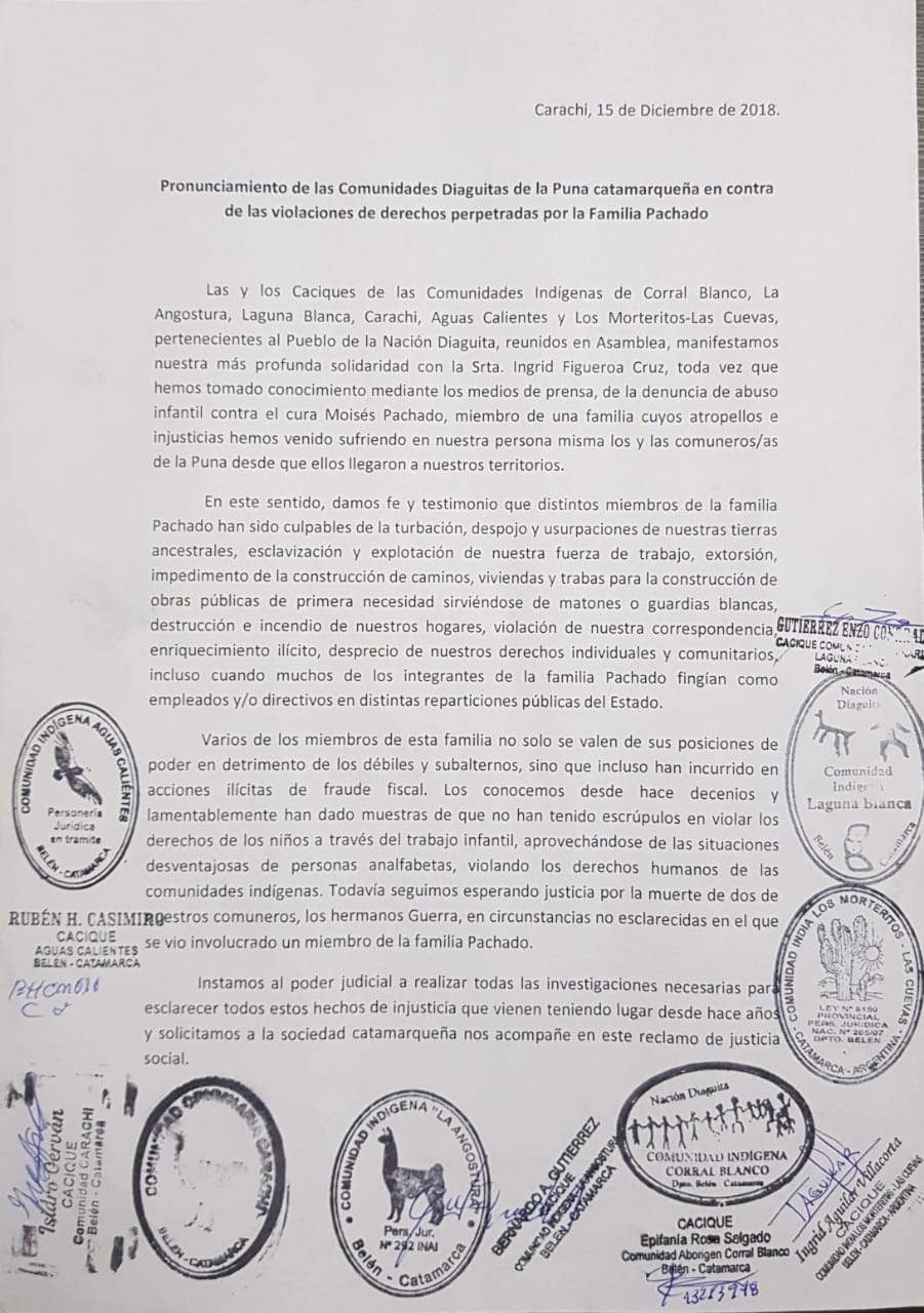 También las comunidades diaguitas acusan a la familia Pachado, en la que está incluido el sacerdote radicado en Andalgalá, de “la turbación, despojo y usurpaciones de nuestras tierras ancestrales, esclavización y explotación”.