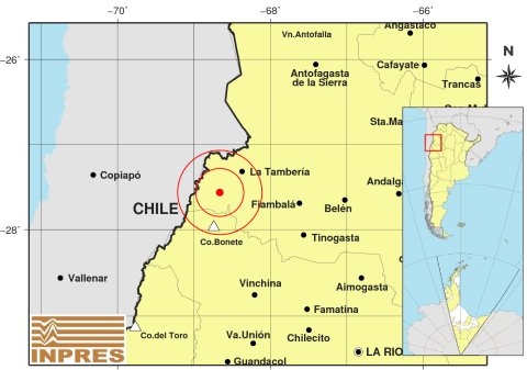 Epicentro: 271 Km. al NO de La Rioja; 304 Km. al O de San F. Del Valle De Catamarca; 40 Km. al SO de La Tambería -27.565 (lat) -68.662 (long)