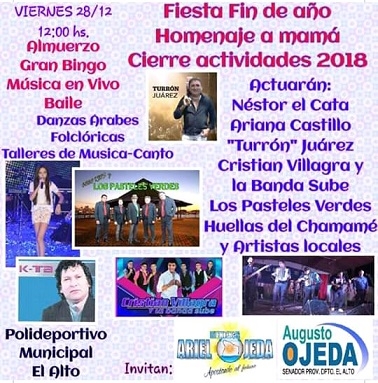 Habrá un almuerzo criollo para todos los presente, regalos para las madres, números folclóricos, actuación de la academia municipal de danzas, danzas arabes, escuela de canto y guitarras, y demás sorpresas.