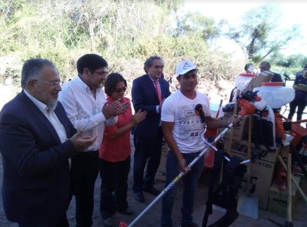 De esta manera, la gobernadora y el ministro de Producción entregaron herramientas y maquinarias destinadas al manejo del monte frutal, para cada uno de los beneficiarios y miembros de la Asociación. 26 mochilas mecánicas, 26 motoguadañas, 26 podones manuales, 26 podones de altura manuales, 26 serruchos de poda profesional, 26 kit de herramientas varias, palas, carretillas, tenazas, etc.