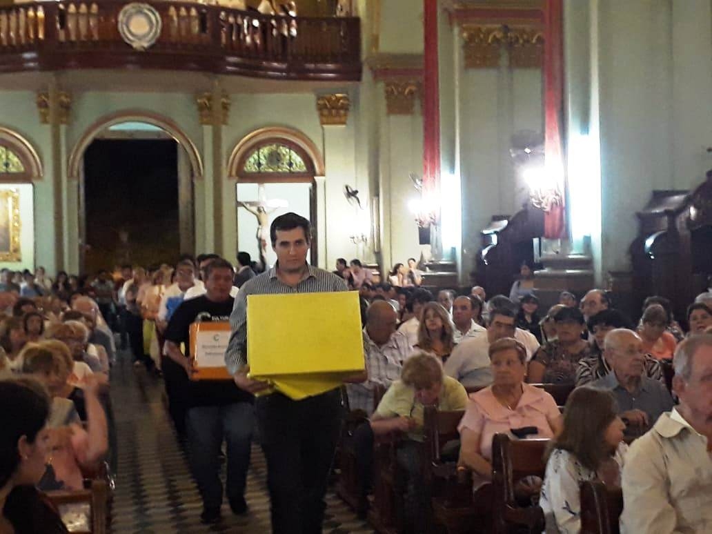 Luego de la oración de los fieles, los alumbrantes acercaron las ofrendas hasta el altar, consistentes en elementos para la atención de los peregrinos, junto con el pan y el vino para ser consagrados.