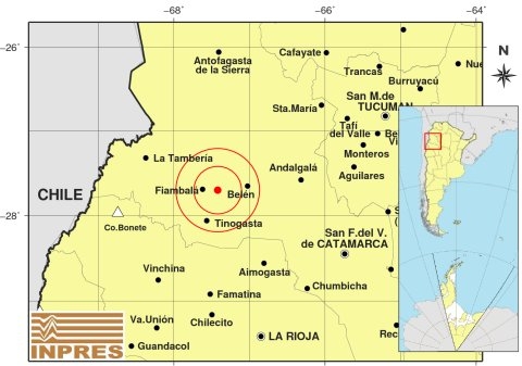 Epicentro: 185 km al NO de San F. Del Valle De Catamarca, 198 km al N de La Rioja, 19 km al E de Fiambalá. -27.701 (lat) -67.419 (long)