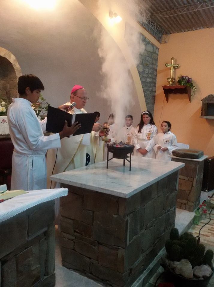 La ceremonia litúrgica, presidida por el Obispo Diocesano, Mons. Luis Urbanc, y el párroco de la zona, Pbro. Eugenio Pachado, dio inicio con la lectura del decreto correspondiente. Luego se procedió a la bendición de la pila bautismal y se roció al pueblo con agua bendita.