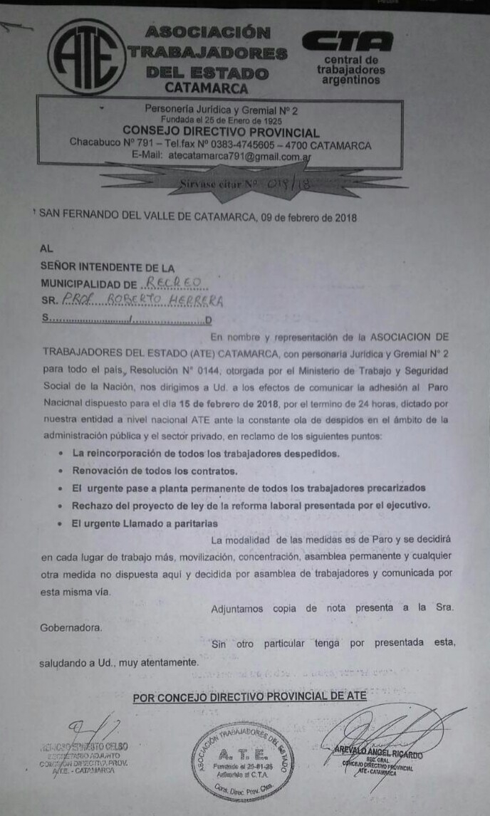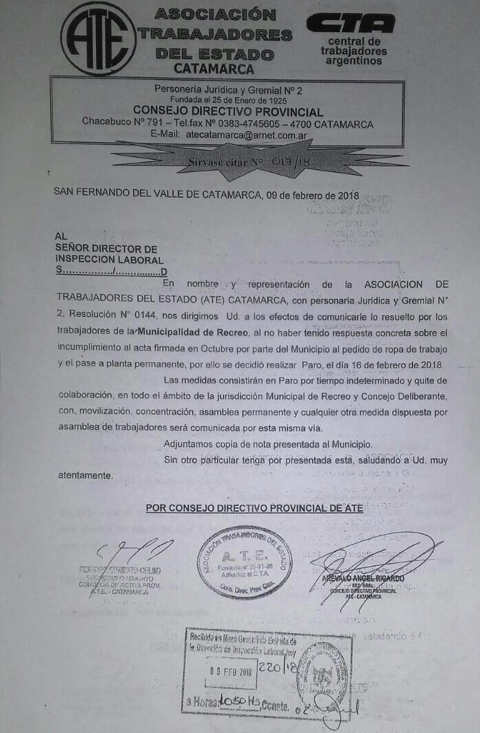 La medidas consistirán en paro y quite de colaboración en todo ámbito de la jurisdicción de la Municipalidad de Recreo y Concejo Deliberante con concentración, movilización y asamblea permanente desde las 8 horas, en la oficina ubicada en calle Moreno 139.
