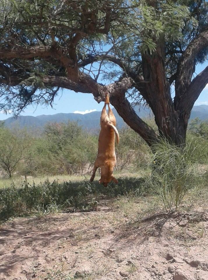 Es así que decenas de perros corren la misma tragedia. Los cuelga vivos con un corte así se ahoguen con la sangre y sufren hasta que mueren.