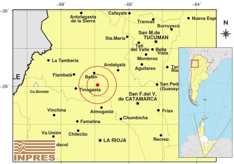 Epicentro: 128 Km. al NO de San F. Del Valle De Catamarca, 160 Km. al N de La Rioja, 37 Km. al S de Belén. -27.969 (lat) -66.922 (long)