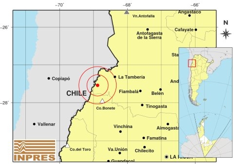 Epicentro: 135 Km. al NO de La Rioja, 163 Km. al O de San F. Del Valle De Catamarca, 31 Km. al SE de Tinogasta. -28.296 (lat) -67.389 (long)