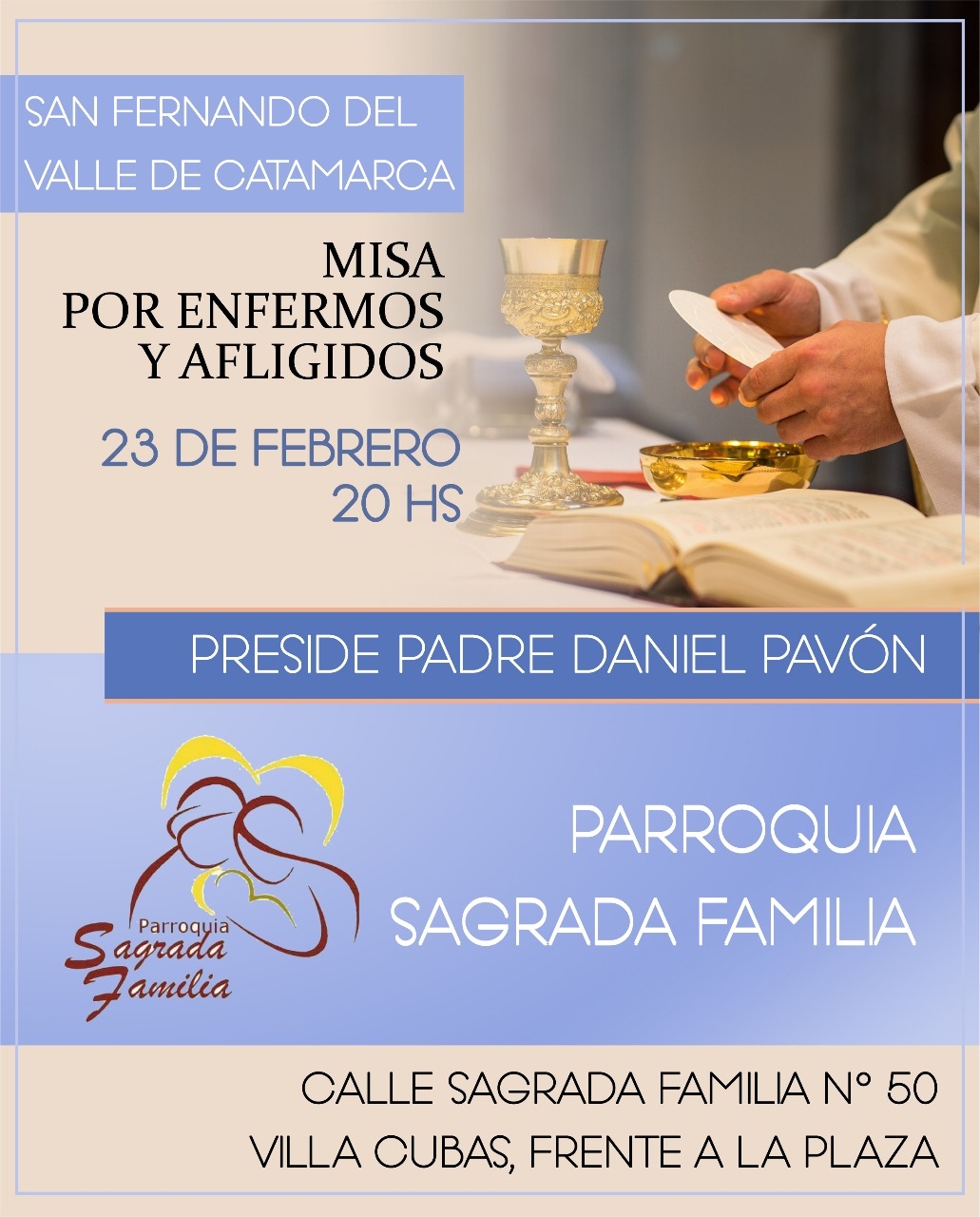 El viernes 23 de febrero, a las 20.00, se celebrará la misa por enfermos y afligidos en la parroquia de la Sagrada Familia, ubicada frente a la plaza de Villa Cubas.