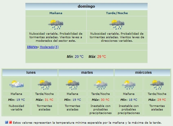 En la jornada de este domingo, está prevista una máxima de 29°C y una mínima de 20°C, con amenaza de lluvia durante todo el día.