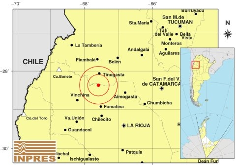 Epicentro: 137 Km. al NO de La Rioja, 181 Km. al O de San F. Del Valle De Catamarca, 34 Km. al S de Tinogasta. -28.368 (lat) -67.589 (long)