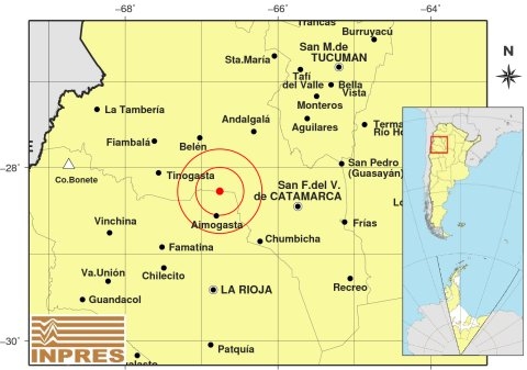 Epicentro: 102 Km. al O de San F. Del Valle De Catamarca, 126 Km. al N de La Rioja, 32 Km. al N de Aimogasta. -28.275 (lat) -66.762 (long)