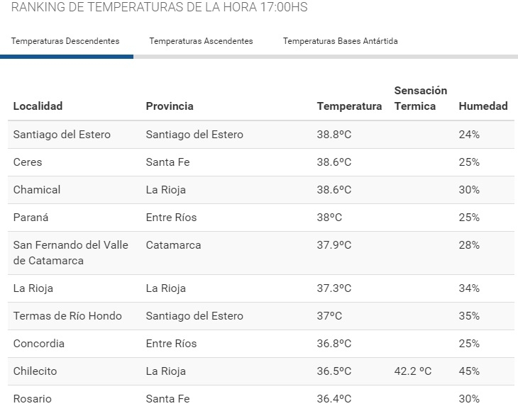 Según el ranking de temperaturas elaborado por el Servicio Meteorológico Nacional, la Capital catamarqueña es a esta hora la 5° ciudad más caliente. La primera es Santiago del Estero.