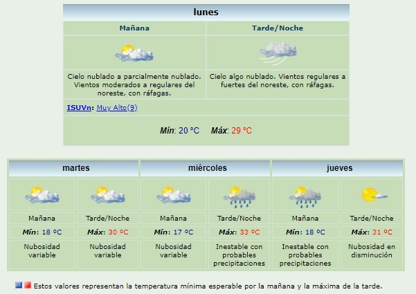 Para hoy lunes, la mínima pronosticada es de 20°C y la máxima prevista es de 29°C con vientos regulares a fuertes del noreste por la tarde.