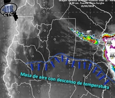 En esta imagen satelital, de hace poco más de una hora, se puede notar cómo un débil sistema frontal avanza hacia el norte del país, trayendo consigo aire un poco más fresco. En esa línea azul viene presentándose el viento sur, que no tendrá grandes velocidades. Será más bien entre suave y moderado.