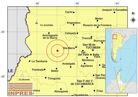 Epicentro: 176 Km. al O de San Miguel De Tucumán, 214 Km. al NO de San F. Del Valle De Catamarca, 88 Km. al N de Belén. -26.856 (lat) -66.972 (long)