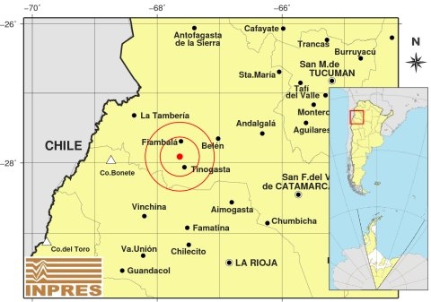Epicentro: 184 km al NO de La Rioja, 196 km al O de San F. Del Valle De Catamarca, 18 km al NO de Tinogasta. -27.910 (lat) -67.639 (long)