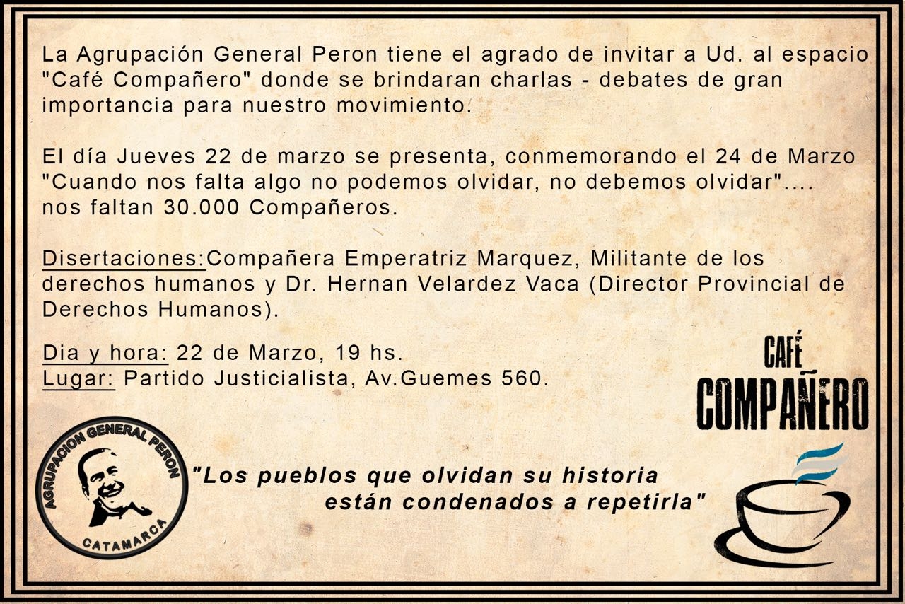 Con tal motivo y en adhesión a la “Semana de la Memoria” que se lleva a cabo en Catamarca, en la sede partidaria del PJ, sita en la Av. Güemes 560, a partir de las 19 hs., de este jueves se escucharán las disertaciones de la militante por los Derechos humanos, Emperatriz Márquez, y del director provincial de Derechos Humanos, Dr. Hernán Velardez Vaca.