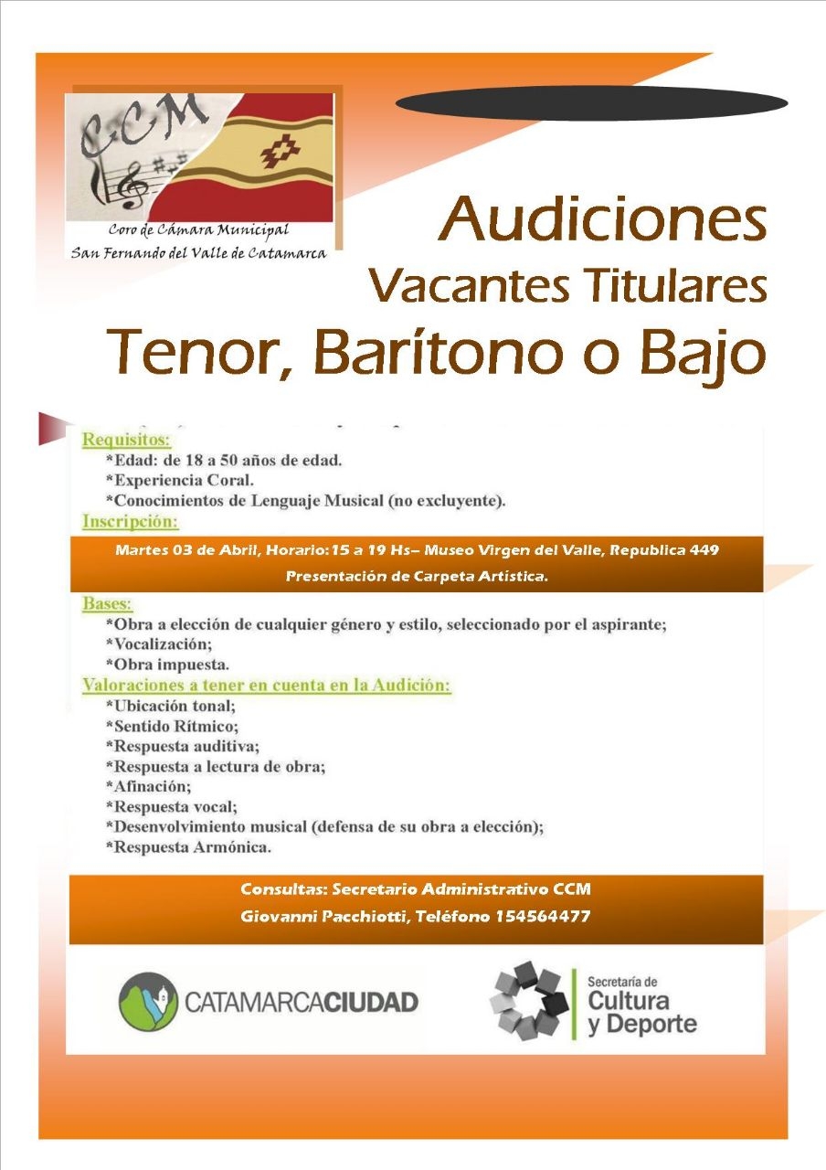 La audición se llevará a cabo el lunes 9 de abril, en el horario de 15 a 19 horas en el Salón de Conferencias del Museo de la Virgen del Valle, ubicado en Republica 449.