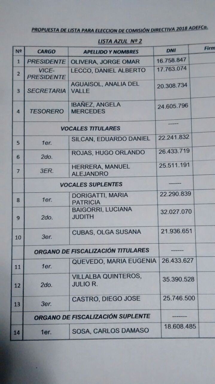 A Olivera lo secundan Daniel Alberto Lecco como vicepresidente; Analía del Valle Aguaisol como secretaria y Ángela Mercedes Ibáñez como tesorera. Los vocales titulares son Eduardo Daniel Silcán (1º), Hugo Orlando Rojas (2º) y Manuel Alejandro Herrera (3º), y los vocales suplente María Patricia Dorigatti (1ª), Luciana Judith Baigorrí (2ª) y Olga Susana Cubas (3ª).