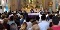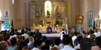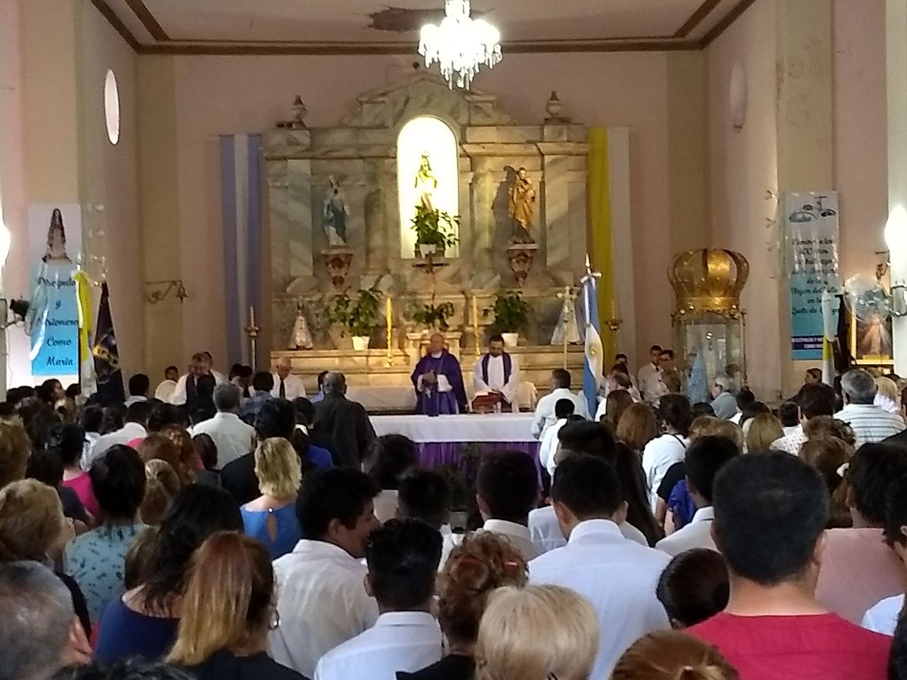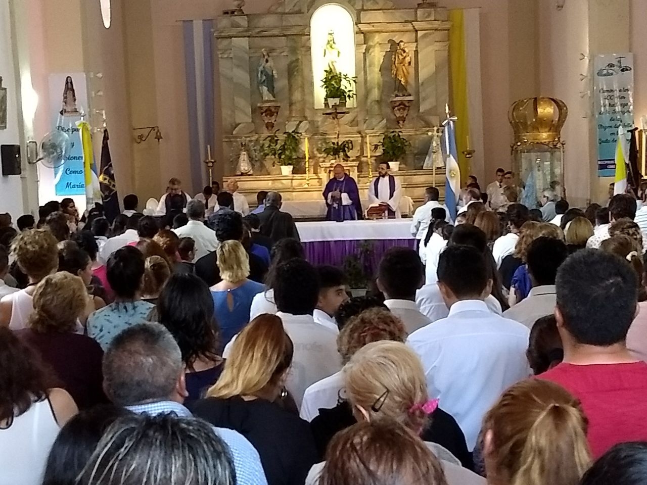 Finalizado el acto, la Virgen del Valle fue llevada hasta el templo parroquial de Nuestra Señora de Luján, donde se congregaron cientos de fieles para participar de la Santa Misa, presidida por el Obispo Diocesano, Mons. Luis Urbanc, y concelebrada por el Vicario para la Educación, Pbro. Oscar Tapia, y el párroco, Pbro. Marcelo Amaya.
