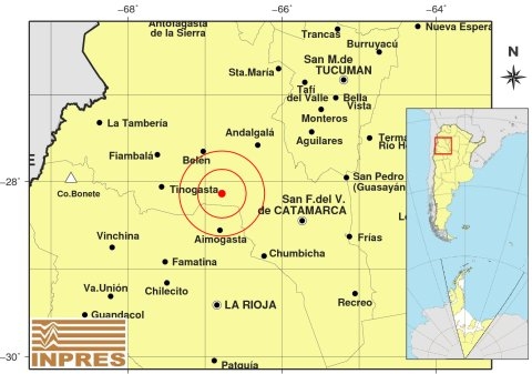 Epicentro: 108 Km. al O de San F. Del Valle De Catamarca, 141 Km. al N de La Rioja, 47 Km. al N de Aimogasta. -28.139 (lat) -66.782 (long)