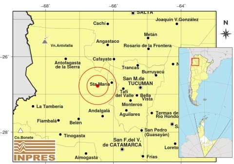 Epicentro: 126 Km. al O de San Miguel De Tucumán, 199 km al N de San F. Del Valle De Catamarca, 43 Km. al O de Sta.María. -26.779 (lat) -66.465 (long)