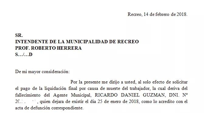 Según el Dr. Ariel Salavarría, representante de Ávila, el 14 de febrero pasado "mi representada envió Nota al Intendente Roberto Herrera y nunca recibió respuesta alguna" y agregó "es por eso que ahora se ve en la obligación, dado deudas contraídas con el servicio de sepelio, a enviar Carta Documento de Intimación, reservándose el derecho de iniciar denuncia penal por retención indebida de haberes y acciones legales que deriven de la misma".
