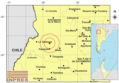 Epicentro: 219 Km. al NO de San F. Del Valle De Catamarca, 236 Km. al N de La Rioja, 33 Km. al N de Fiambalá. -27.393 (lat) -67.616 (long)