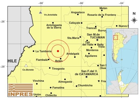 Epicentro: 188 Km. al NO de San F. Del Valle De Catamarca, 202 Km. al O de San Miguel De Tucumán, 39 Km. al N de Belén. -27.318 (lat) -67.156 (long)