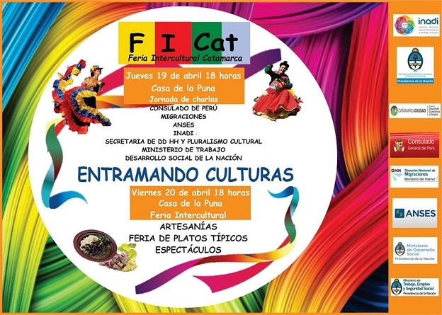 La delegación en Catamarca del INADI, junto con la Secretaria de Derechos Humanos y Pluralismo Cultural de la Nación y la Secretaría de Desarrollo Económico y Empleo de la Municipalidad Capital , impulsaron la creación de la 1º Feria Intercultural Catamarca (FICAT) Entramando Culturas, la cual se realizará, los días jueves 19 con un ciclo de charlas y viernes 20 de abril, con la puesta en marcha de la feria intercultural.