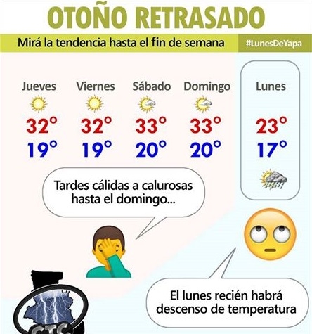 De acuerdo a nuestro análisis, la circulación de aire cálido y relativamente seco durará al menos hasta el domingo, pues para el lunes se avisora un cambio de tiempo, con descenso de temperatura.