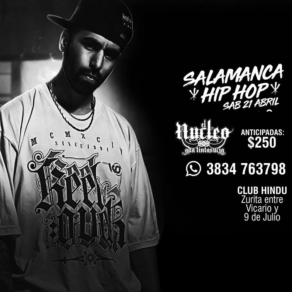 Hoy Catamarca tendrá una noche a todo Hip Hop con Salamanca Hip Hop II, que propone la presentación de un altísimo exponente del rap argentino y latinoamericano: Núcleo a.k.a TintaSucia, que junto a Dj Pela llegan desde Buenos Aires por primera vez en nuestra provincia para llenar de estilo la sala.