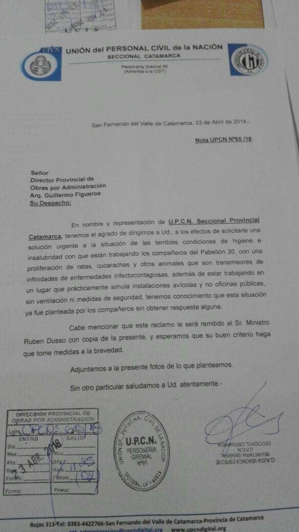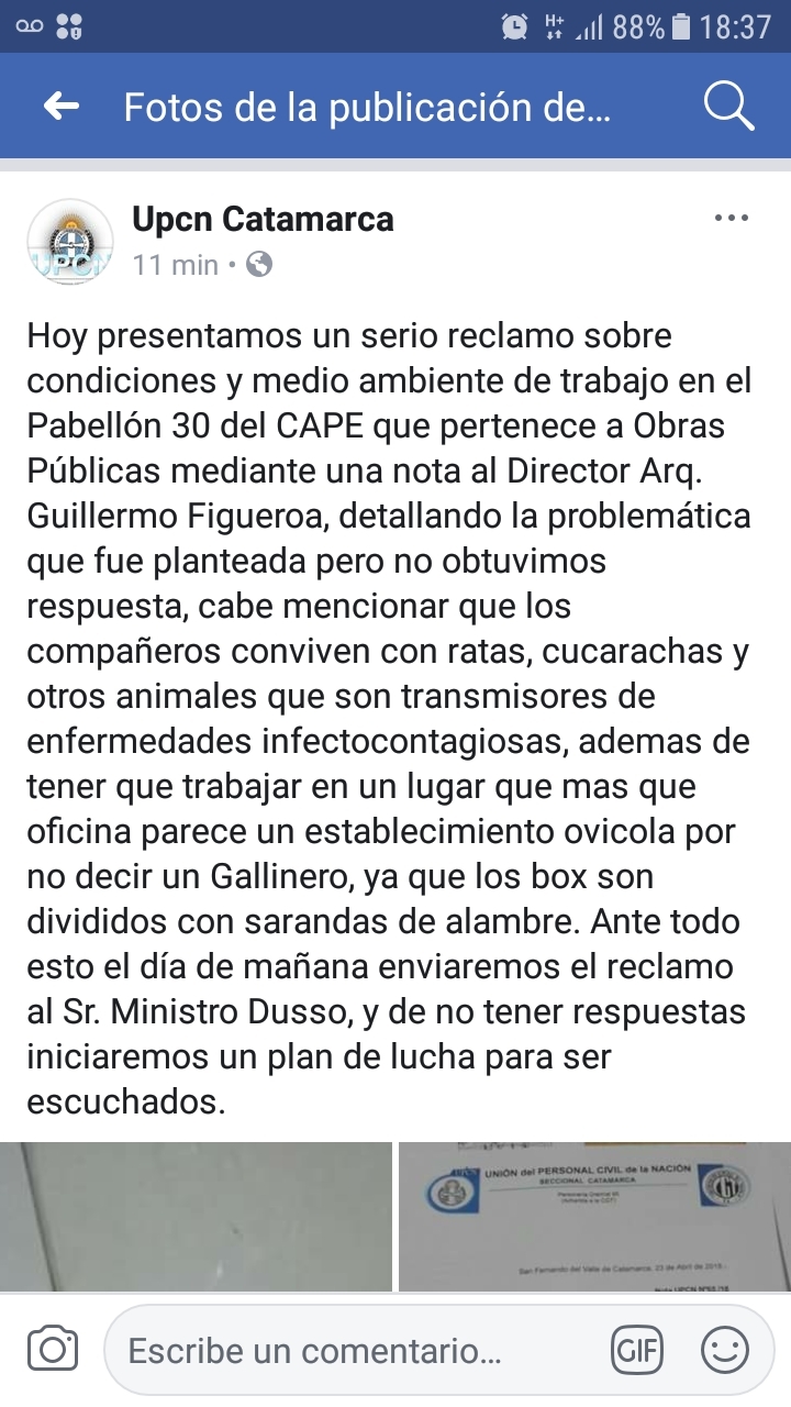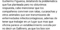 “Los compañeros conviven con ratas, cucarachas y otros animales que son transmisores de enfermedades infectocontagiosas, además de tener que trabajar en un lugar que más que oficina parece un establecimiento avícola por no decir un gallinero, ya que los box son divididos con zarandas de alambre”, postó el gremio en cuenta de Facebook.
