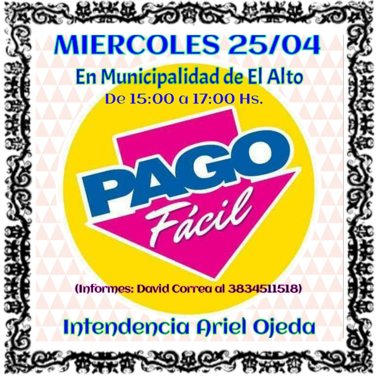 Pago Fácil estará en las oficinas del municipio de Villa de El Alto a partir de las 15 hasta las 17 horas, oportunidad en la que se podrá abonar todo referido a boletas de abono de telefonía celular, luz, impuesto al automotor, etc.