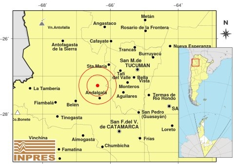 Epicentro: 126 km al O de San Miguel De Tucumán, 147 km al NO de San F. Del Valle De Catamarca, 37 km al N de Andalgalá. -27.247 (lat) -66.378 (long)