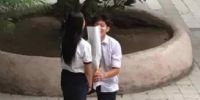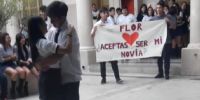 Ayudado por sus compañeros, quienes sostenían la bandera que dejaba en claro su pedido: “Flor, ¿aceptas ser mi novia?”, el jovencito se puso de rodillas y le entregó una flor.
