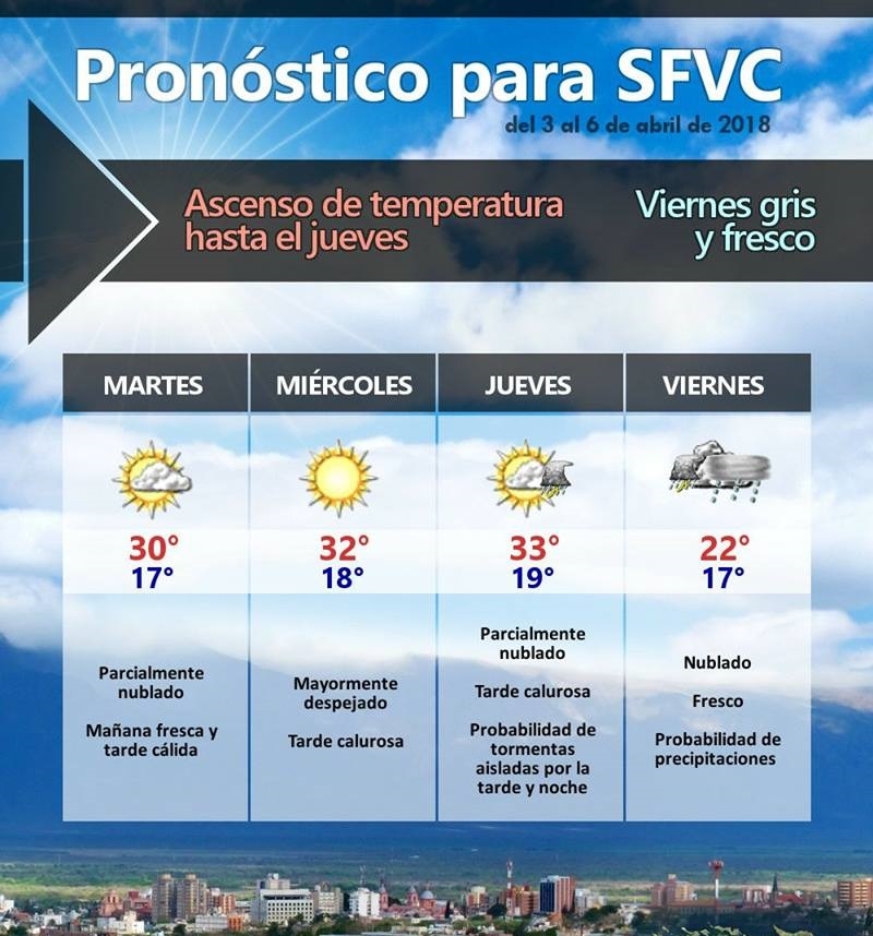 Hasta ahora se ve un cambio de tiempo muy importante que implica aumento de nubosidad, probabilidad de lluvias y un gran descenso de temperatura que nos dará un día fresco en toda la provincia.