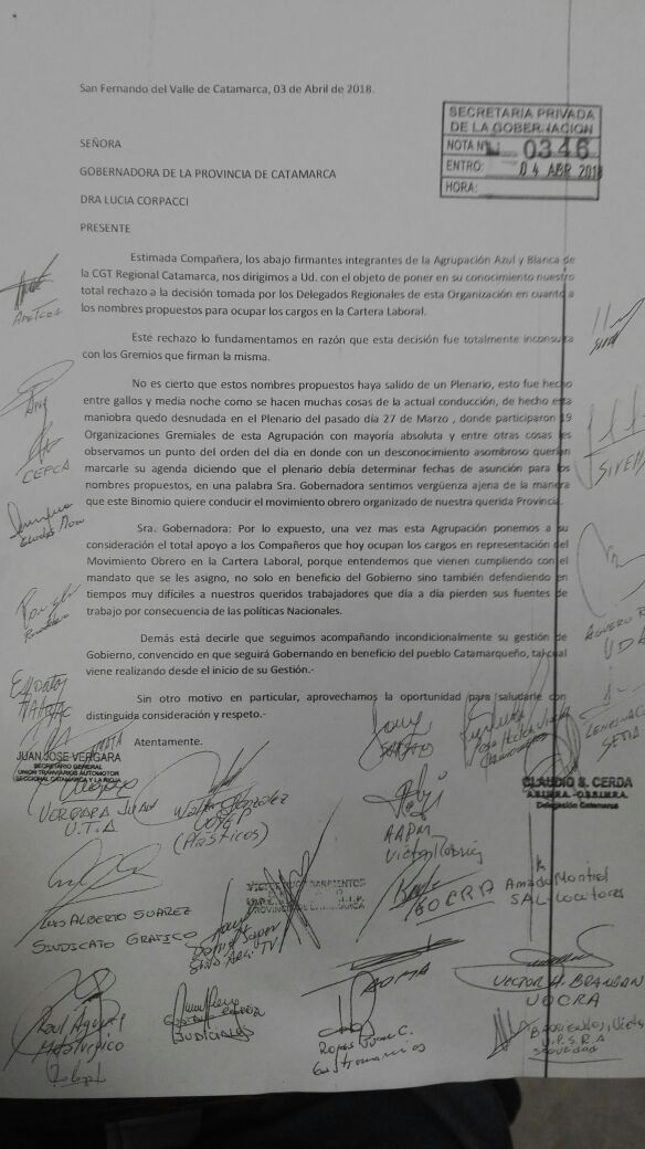 “Estimada compañera, los abajo firmantes integrantes de la Agrupación Azul y Blanca de la CGT Regional Catamarca, nos dirigimos a Ud. con el objeto de poner en su conocimiento nuestro total rechazo a la decisión tomada por la Delegados Regionales de esta organización en cuanto a los nombres propuestos para ocupar los cargos en la cartera laboral.