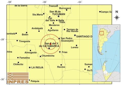 Epicentro: 25 Km. al N de San F. Del Valle De Catamarca, 146 Km. al O de Santiago Del Estero, 58 Km. al SO de San Pedro. -28.230 (lat) -65.664 (long)