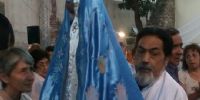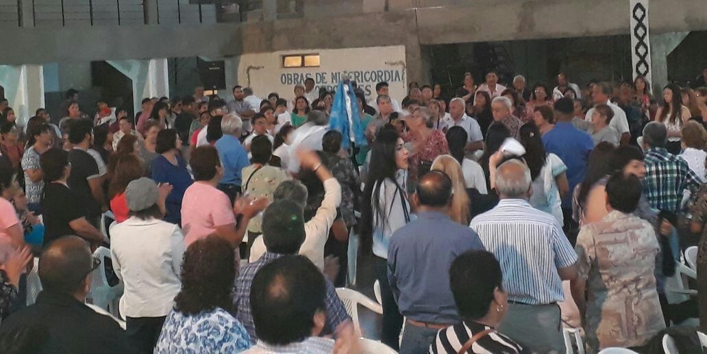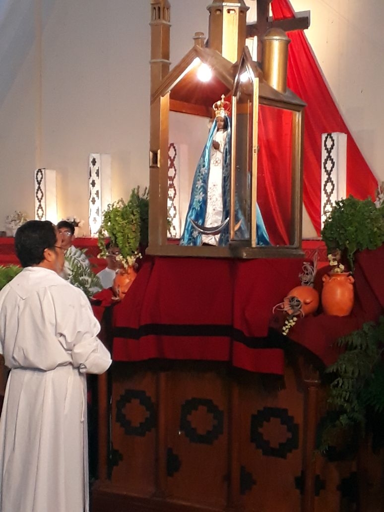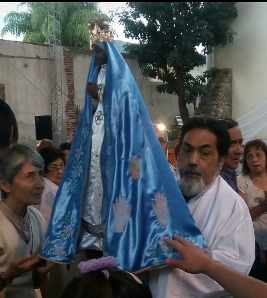La ceremonia se cumplió desde el salón hasta la cancha del predio parroquial, donde se desarrollan los actos litúrgico con el rezo del Santo Rosario, Letanías y Septenario.