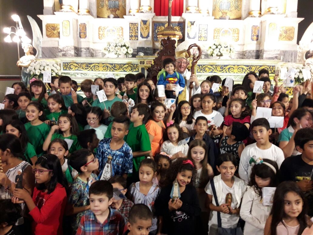 Los pequeños fueron invitados por el Obispo a ubicarse en el Presbiterio junto con él para que puedan estar cómodos y cerca de la Madre Morena.