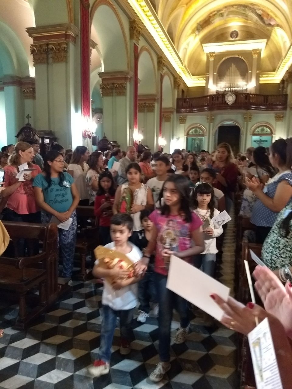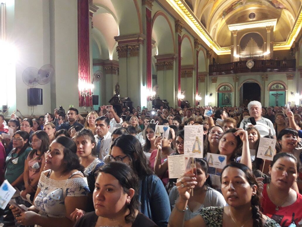 La Misa central de la jornada dio inicio con el ingreso del Obispo Diocesano, Mons. Luis Urbanc, y el Pbro. Santiago Granillo, Asesor de la Pastoral de la Niñez, precedidos por una procesión de niños de todas las edades llevando en brazos imágenes de la Virgen María y de los Santos para ser bendecidos como un gesto en el Año de la Piedad Popular, que vive la Iglesia en su camino a la celebración de los 400 años de la presencia maternal de María en el Valle. Por su parte, las mujeres embarazadas se ubicaron en la nave central, luciendo pequeños mantos de la Virgen obsequiados por el Equipo de la Pastoral de la Niñez.