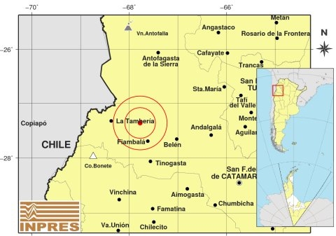 Epicentro: 234 Km. al NO de San F. Del Valle De Catamarca, 245 Km. al N de La Rioja, 40 Km. al NO de Fiambalá. -27.358 (lat) -67.776 (long)