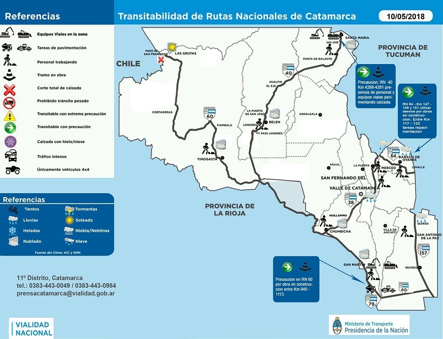 Ruta Nacional Nº 60: Transitable hasta el límite internacional con Chile. Entre kilómetros 1.002 y 1.025 conducir con precaución por trabajos de repavimentación de calzada y conformación de banquinas. El Paso de San Francisco se encuentra CERRADO por nevadas sobre Ruta CH 32 (Chile).