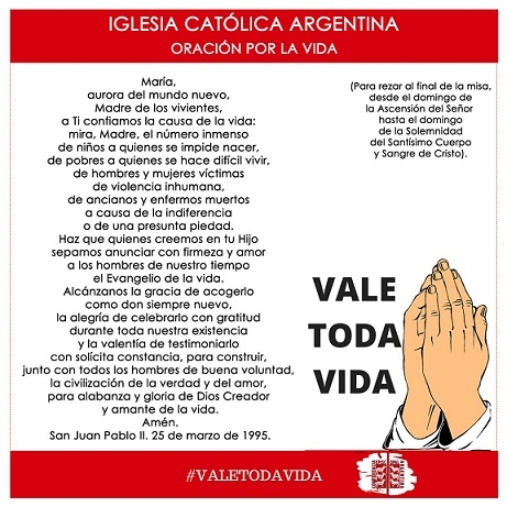 Se convoca a “orar incesantemente”, de manera individual o en las comunidades parroquiales, especialmente en las celebraciones litúrgicas, en el seno de las familias, entre amigos o en el contexto laboral. Este llamado a la oración se enmarca en la campaña que la Iglesia Argentina ha comenzado en el Domingo de Ramos y tiene el hashtag #ValeTodaVida. La oración inspirada y movida por el Espíritu nos permitirá a todos confesar con el entendimiento y el corazón que "Vale Toda Vida".