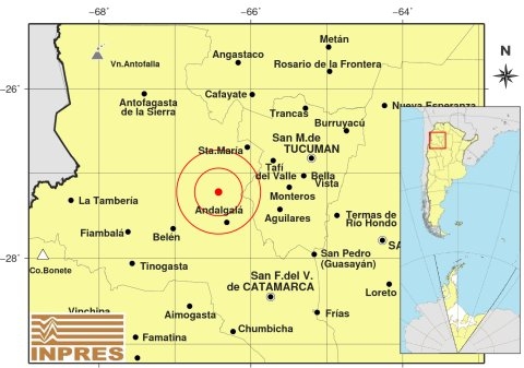 Epicentro: 130 Km. al O de San Miguel De Tucumán, 152 Km. al NO de San F. Del Valle De Catamarca, 41 Km. al N de Andalgalá. -27.222 (lat) -66.426 (long)
