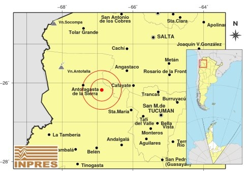 Epicentro: 182 km al NO de San Miguel De Tucumán, 210 km al SO de Salta, 54 km al E de Antofagasta De La Sierra. -26.181 (lat) -66.879 (long)