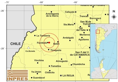 Epicentro: 195 Km. al NO de San F. Del Valle De Catamarca, 202 Km. al N de La Rioja, 8 Km. al E de Fiambalá. -27.692 (lat) -67.531 (long)