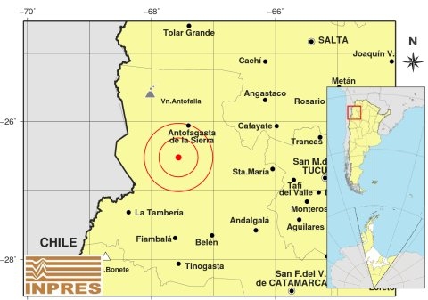 Epicentro: 238 km al O de San Miguel De Tucumán, 279 km al NO de San F. Del Valle De Catamarca, 55 km al S de Antofagasta De La Sierra. -26.524 (lat) -67.565 (long)
