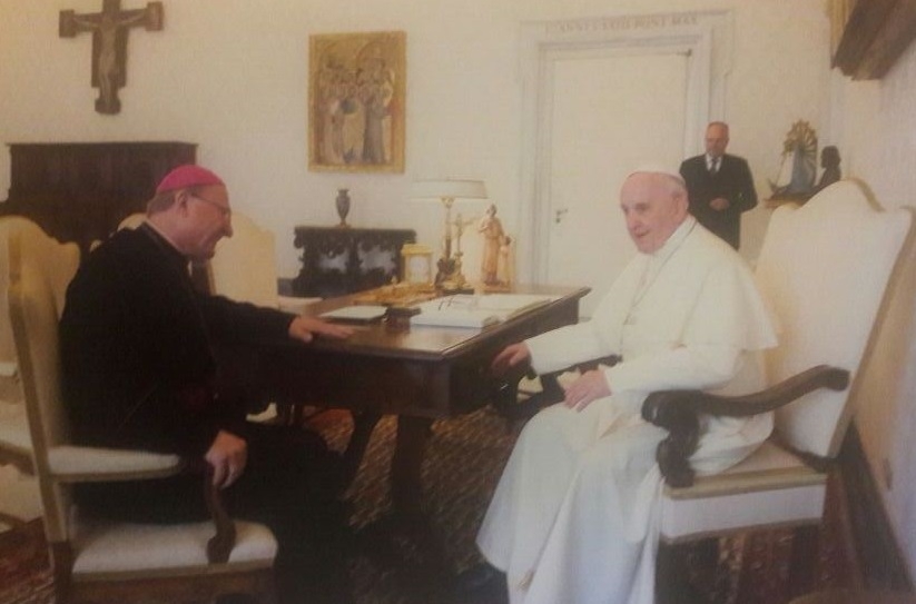 Con ocasión de su visita a Roma por las Bodas de Oro del Camino Neocatecumenal, que trabaja en nuestra diócesis, el miércoles 3 de mayo, el Obispo Diocesano de Catamarca, Mons. Luis Urbanc, mantuvo una audiencia con el Papa Francisco, en la Prefectura Apostólica del Vaticano. Durante la misma pudo abordar distintos temas vinculados con la labor pastoral en la diócesis, particularmente la preparación para el Jubileo por los 400 años del hallazgo de la Imagen de la Virgen del Valle, en 2020, y el Congreso Mariano Nacional, que tendrá como sede la ciudad de Catamarca. Tema excluyente fue el estado de la causa de beatificación del Venerable Fray Mamerto Esquiú, a días de cumplirse el 192° aniversario del natalicio.